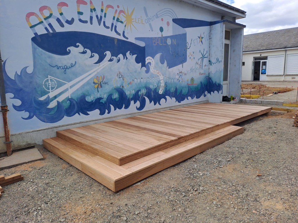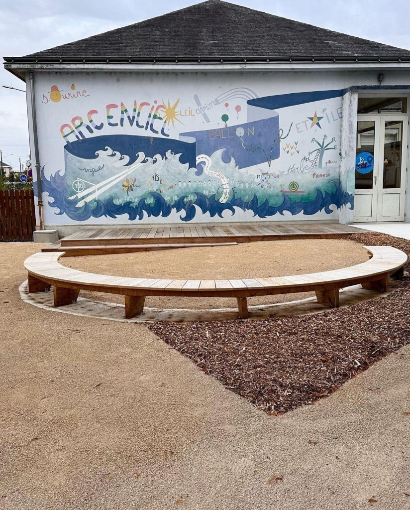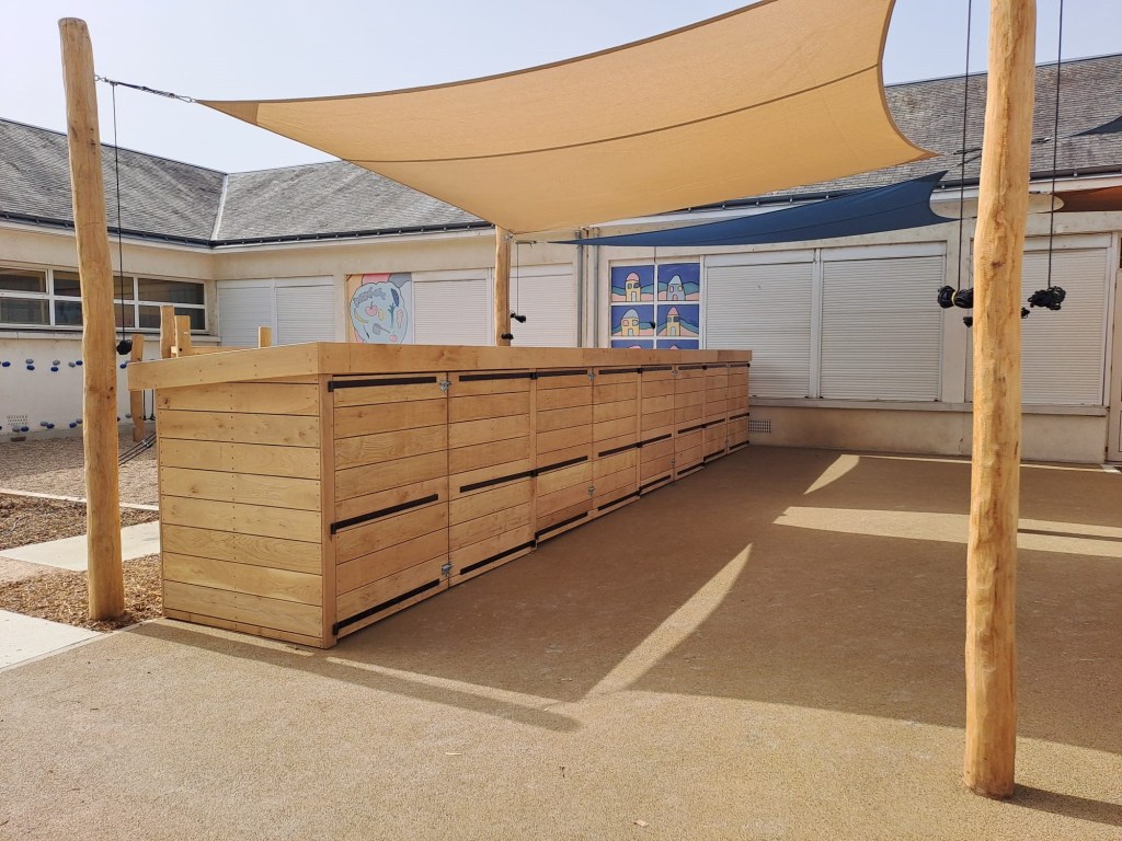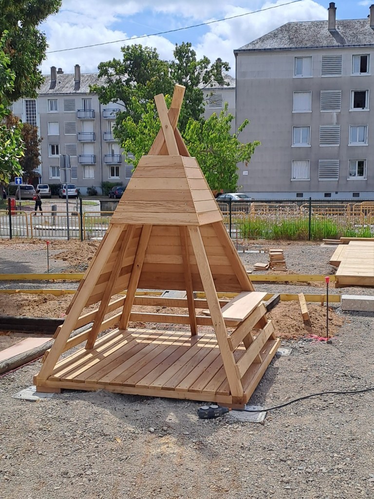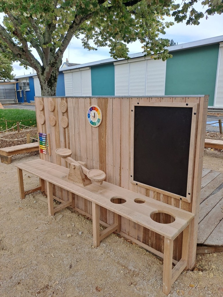 Création de mobilier et de jeux pour les enfants : un tipi, un établi de jeu, un parcours d’équilibre, un rangement pour tricycles, une scénette, des tables et un banc circulaire ont été fabriqués par nos équipes pour améliorer la cour de récréation des plus petits.