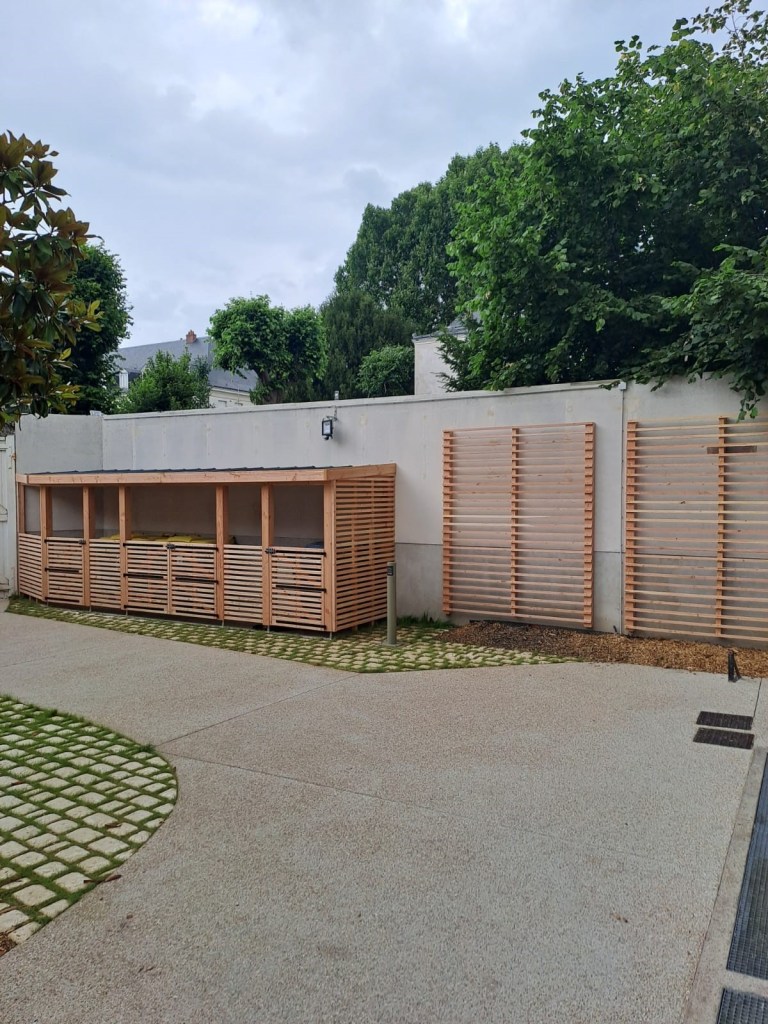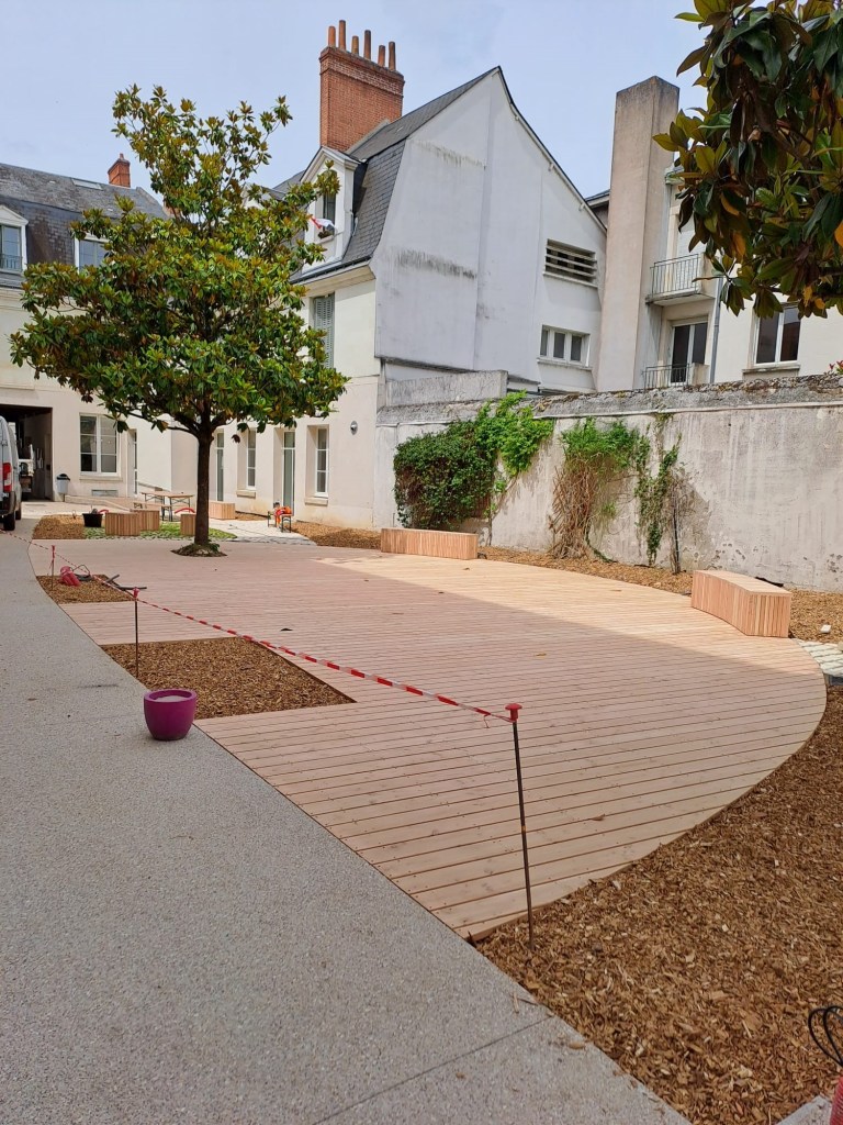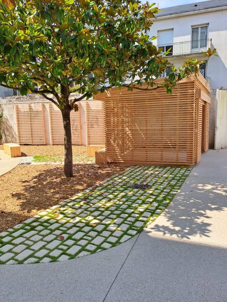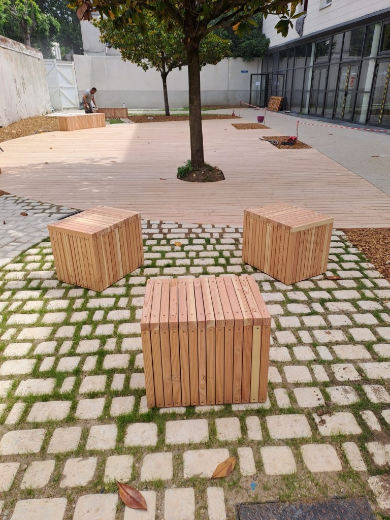Installation d’une terrasse de 100 m² en plein cœur de la ville, avec des assises cubiques et des bancs en tasseaux, ainsi qu’un garage à vélos, un abri à poubelles et des structures de grimpe, ajoutant un cachet naturel à cette cour intérieure.