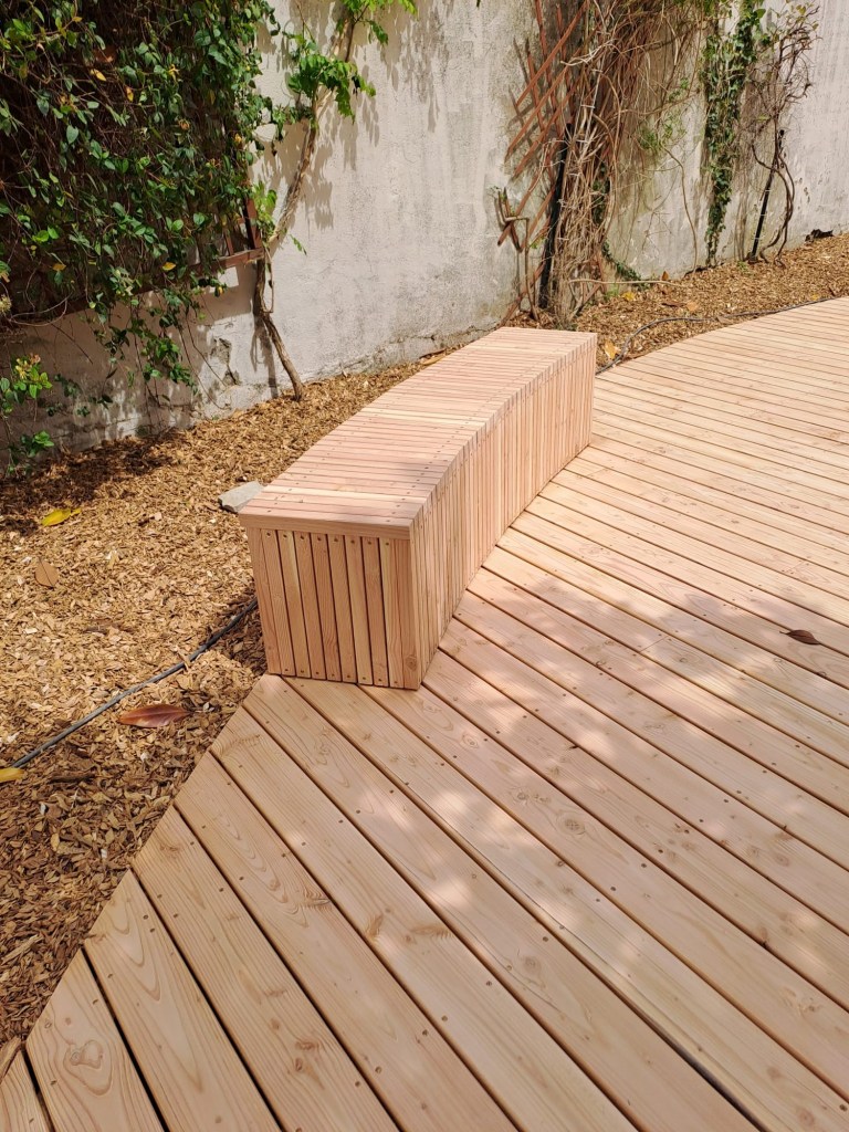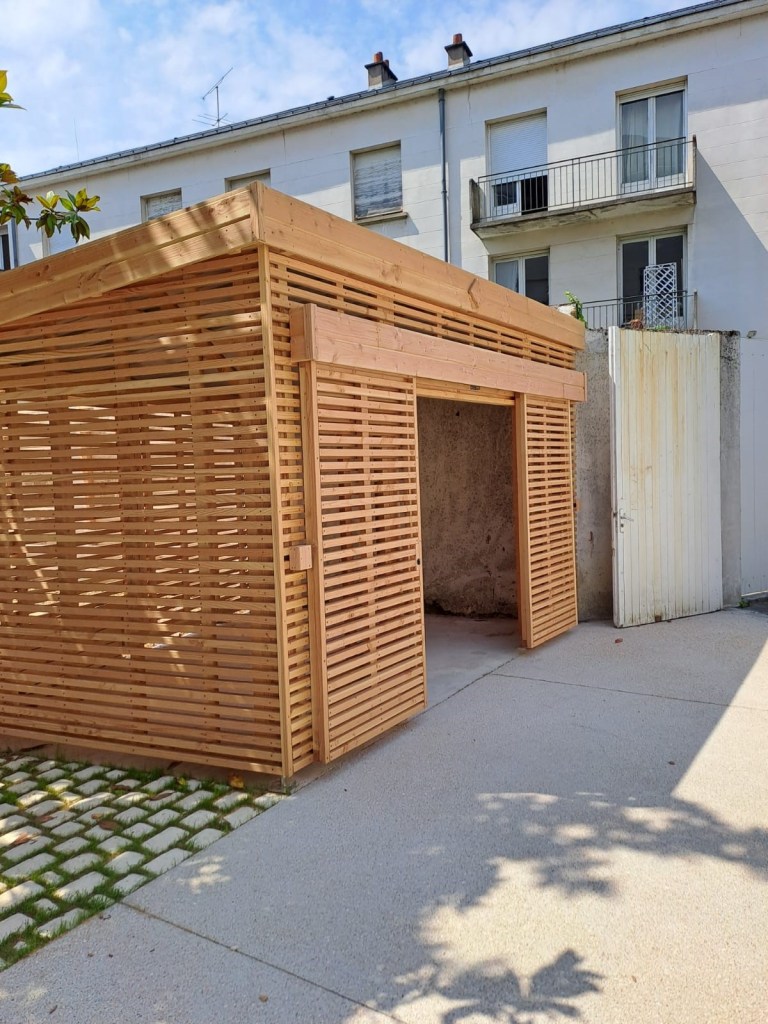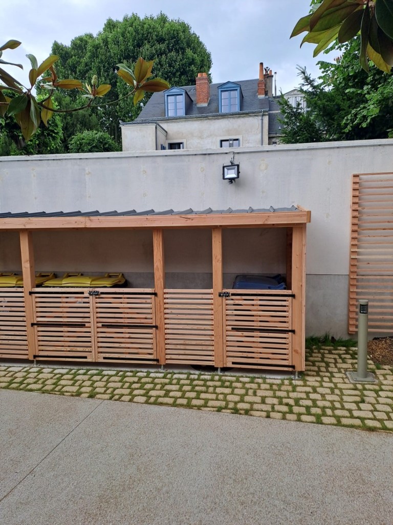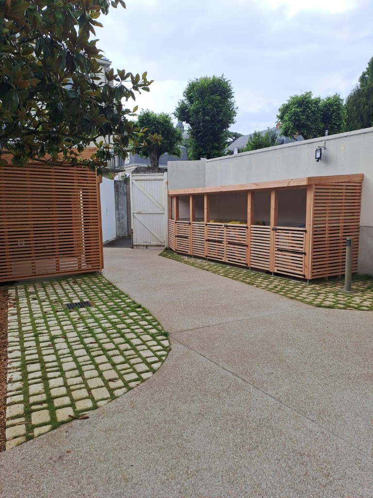 Installation d’une terrasse de 100 m² en plein cœur de la ville, avec des assises cubiques et des bancs en tasseaux, ainsi qu’un garage à vélos, un abri à poubelles et des structures de grimpe, ajoutant un cachet naturel à cette cour intérieure.